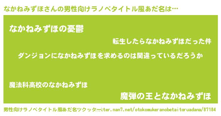 | 女子向けラノベタイトル風あだ名 | 『なかねみずほの卵を拾いまして』 |