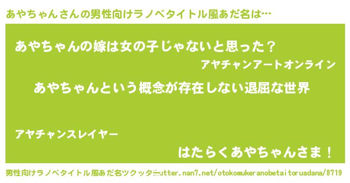 | 女子向けラノベタイトル風あだ名 | 『異世界で失敗しない100のあやちゃん』 |