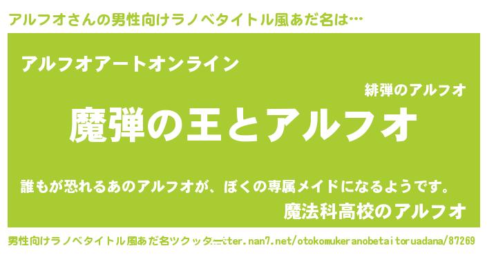 | 女子向けラノベタイトル風あだ名 | 『乙女ゲームの破滅フラグしかない悪役アルフオに転生してしまった…』 |