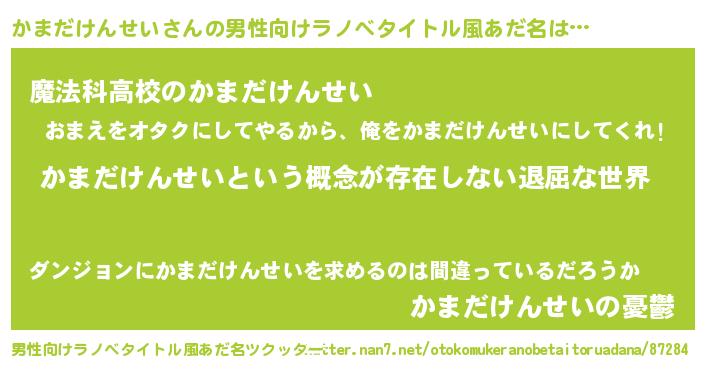 | 女子向けラノベタイトル風あだ名 | 『異世界で失敗しない100のかまだけんせい』 |