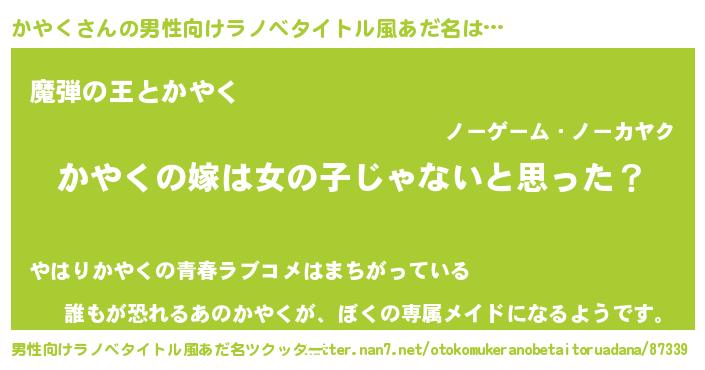 | 女子向けラノベタイトル風あだ名 | 『かやくの卵を拾いまして』 |