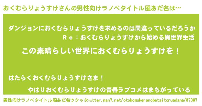 | 女子向けラノベタイトル風あだ名 | 『悪役おくむらりょうすけに転生したようですが、知った事ではありません』 |