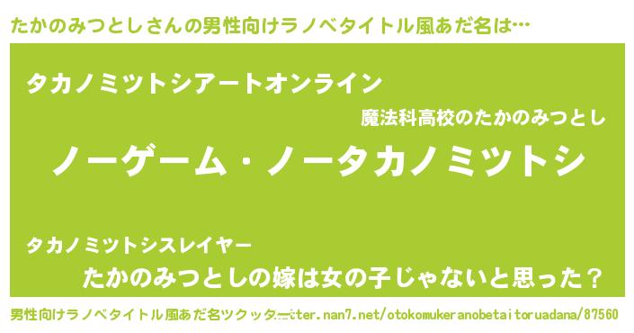 | 女子向けラノベタイトル風あだ名 | 『死神たかのみつとしの再婚』 |