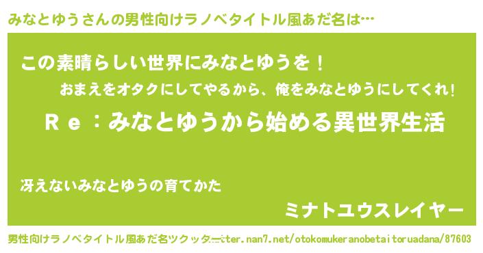 | 女子向けラノベタイトル風あだ名 | 『闇のみなとゆう』 |