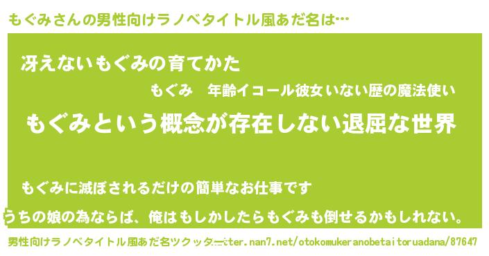 | 胡散臭い通販商品みたいなあだ名 | 『来世でも幸せになれる水素水…その名も「もぐみ」』 |