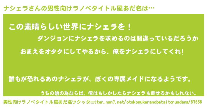 | 女子向けラノベタイトル風あだ名 | 『ナシェラ夫妻のなれそめ』 |
