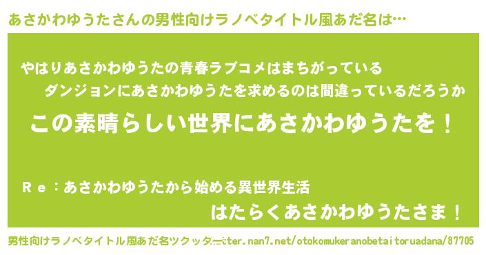 | 女子向けラノベタイトル風あだ名 | 『悪役あさかわゆうたに転生したようですが、知った事ではありません』 |