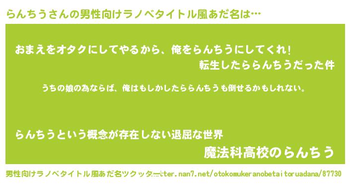 | 女子向けラノベタイトル風あだ名 | 『らんちう伯爵の花嫁』『らんちう恋絵巻』 |