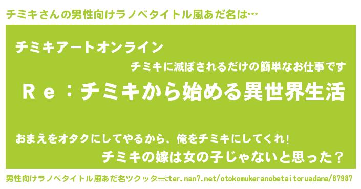 | 女子向けラノベタイトル風あだ名 | 『闇のチミキ』『チミキ様がみてる』 |