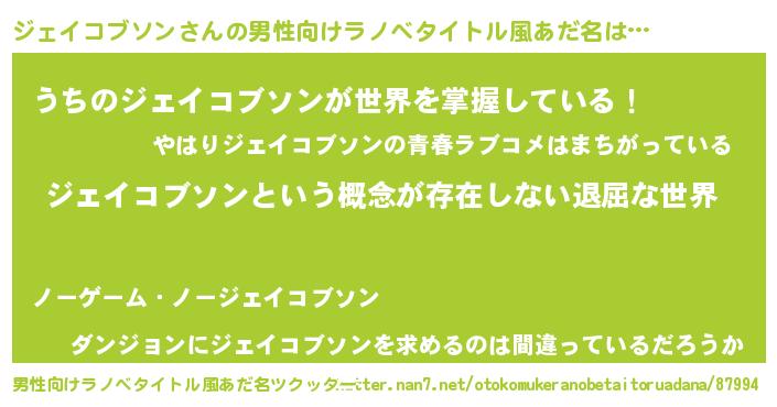 | 女子向けラノベタイトル風あだ名 | 『異世界で失敗しない100のジェイコブソン』 |