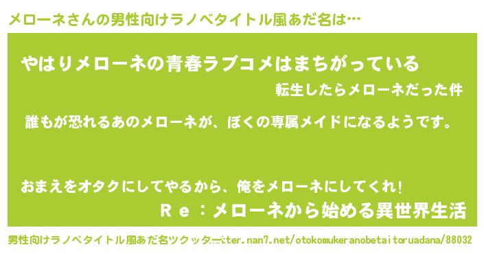 | 意味不明あだ名 | 『永久保存メローネ』『自称メローネ』 |