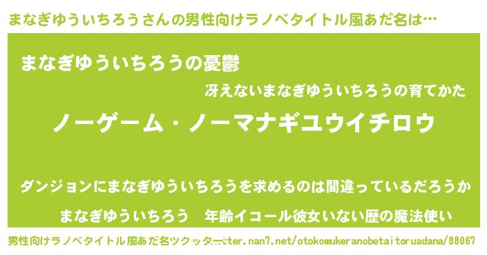 | 女子向けラノベタイトル風あだ名 | 『死神まなぎゆういちろうの再婚』 |