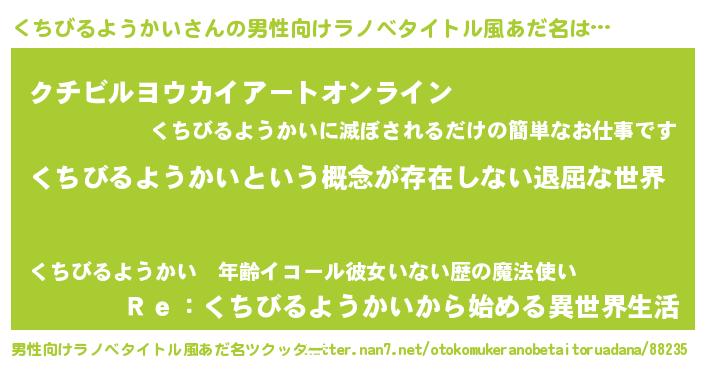 | 女子向けラノベタイトル風あだ名 | 『異世界で失敗しない100のくちびるようかい』 |