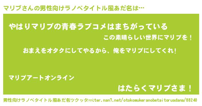 | 女子向けラノベタイトル風あだ名 | 『マリブ恋絵巻』『マリブの雑貨屋さん』 |