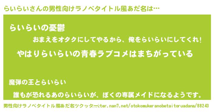 | ヒーロー風カッコイイあだ名 | 『ウルトラらいらいマン』『ネオライライ』 |