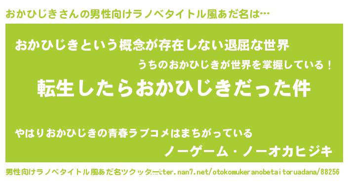 | 女子向けラノベタイトル風あだ名 | 『おかひじきの玉の輿計画!』 |