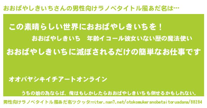 | 胡散臭い通販商品みたいなあだ名 | 『あなたにだけ特別に提供する限定10本のレアな日本酒…その名も「おおばやしきいち」』 |
