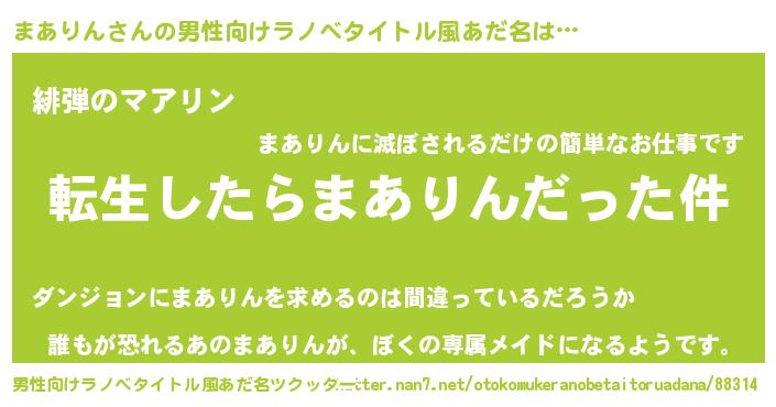 | 胡散臭い通販商品みたいなあだ名 | 『来世でも幸せになれる水素水…その名も「まありん」』 |
