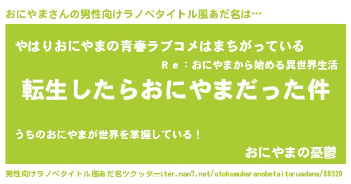 | 女子向けラノベタイトル風あだ名 | 『おにやまの玉の輿計画!』 |