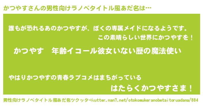 | 女子向けラノベタイトル風あだ名 | 『かつやすの玉の輿計画!』 |