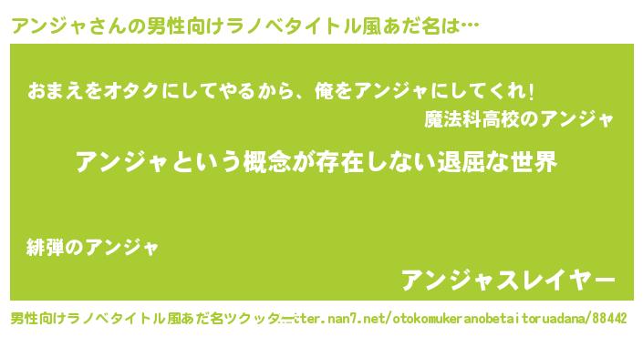 | 女子向けラノベタイトル風あだ名 | 『異世界で失敗しない100のアンジャ』 |
