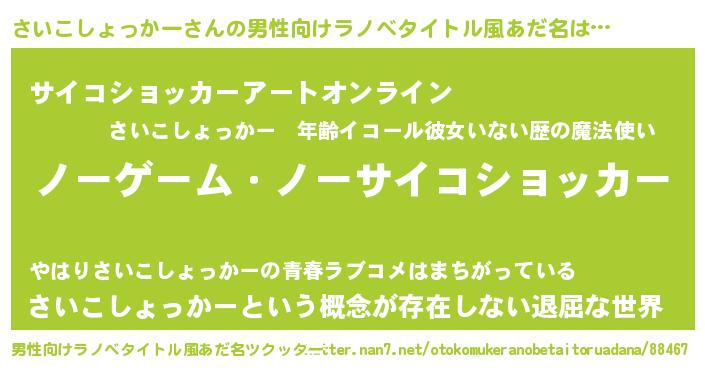 | ヒーロー風カッコイイあだ名 | 『慈愛の使者さいこしょっかー』 |