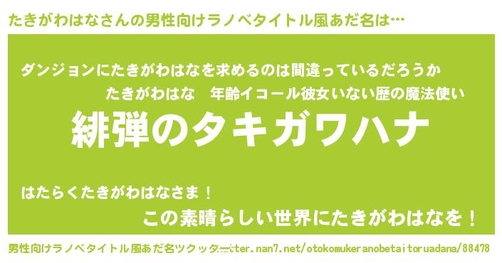 | 胡散臭い通販商品みたいなあだ名 | 『信頼と実績のサプリメント…その名も「たきがわはな」』 |