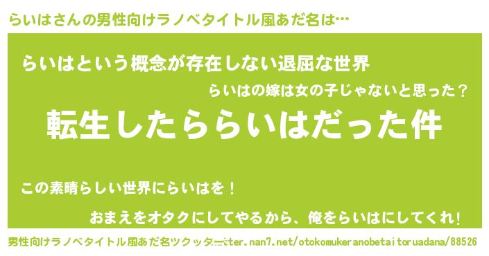 | 胡散臭い通販商品みたいなあだ名 | 『来世でも幸せになれる水素水…その名も「らいは」』 |