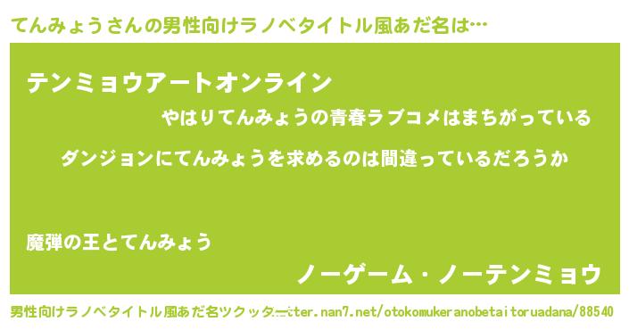 | 女子向けラノベタイトル風あだ名 | 『てんみょうの卵を拾いまして』 |