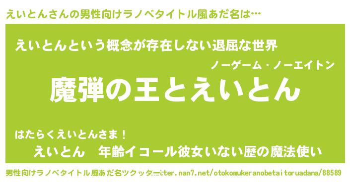 | 女子向けラノベタイトル風あだ名 | 『乙女ゲームの破滅フラグしかない悪役えいとんに転生してしまった…』 |