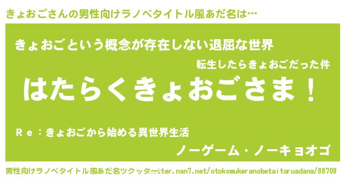 | 胡散臭い通販商品みたいなあだ名 | 『絶対に幸福をもたらす健康食品…その名も「きょおご」』 |
