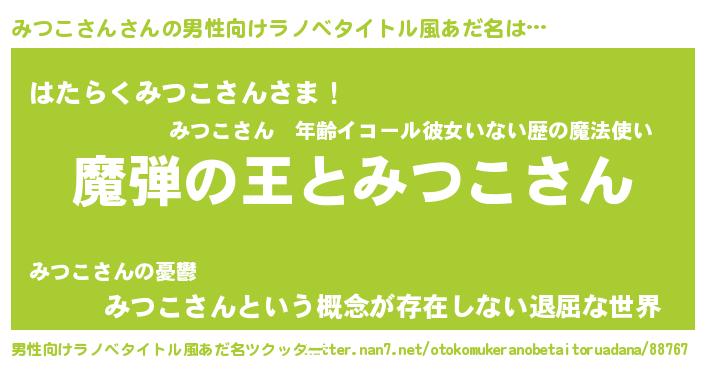 | 女子向けラノベタイトル風あだ名 | 『みつこさんが死なない童話 林檎のみつこさんの診療簿』 |