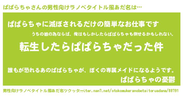 | 女子向けラノベタイトル風あだ名 | 『婚約破棄系悪役ぱぱらちゃに転生したので、保身に走りました。』 |