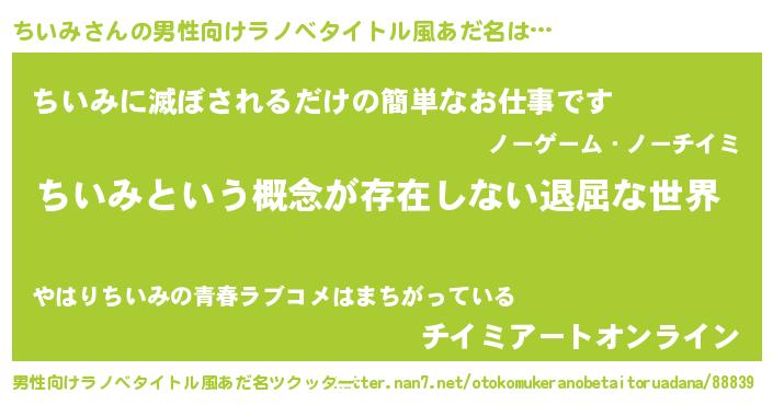 | 女子向けラノベタイトル風あだ名 | 『異世界で失敗しない100のちいみ』 |