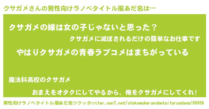 | 女子向けラノベタイトル風あだ名 | 『クサガメ伯爵の花嫁』 |