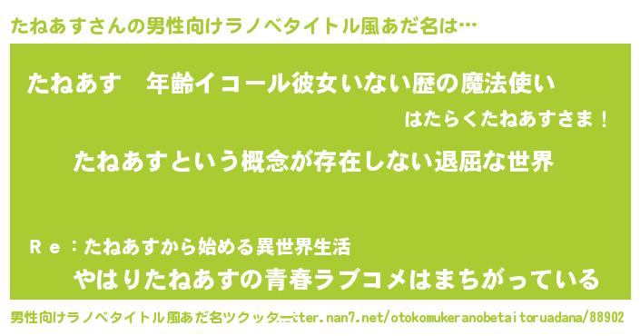 | 女子向けラノベタイトル風あだ名 | 『異世界で失敗しない100のたねあす』 |