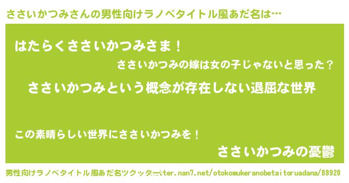 | 胡散臭い通販商品みたいなあだ名 | 『来世でも幸せになれる水素水…その名も「ささいかつみ」』 |