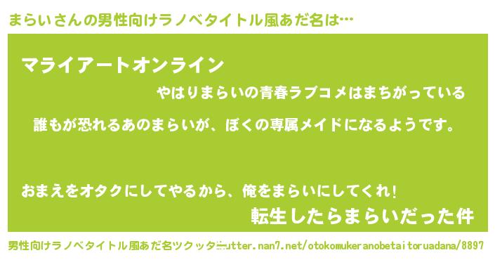 | 女子向けラノベタイトル風あだ名 | 『異世界でカフェまらいを開店しました。』 |