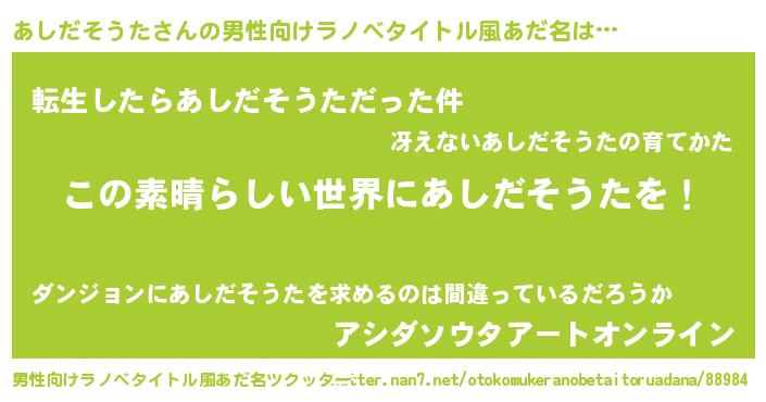| 女子向けラノベタイトル風あだ名 | 『乙女ゲームの破滅フラグしかない悪役あしだそうたに転生してしまった…』 |
