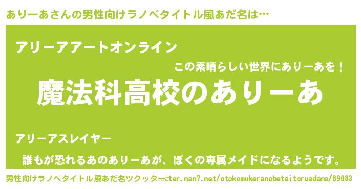 | 女子向けラノベタイトル風あだ名 | 『ありーあなんてお断りですっ。』 |