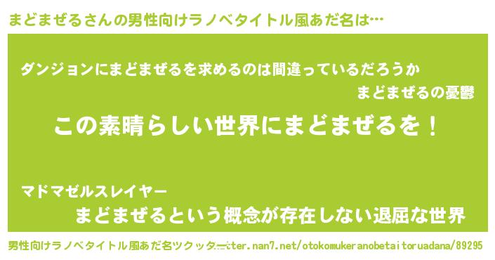 | 女子向けラノベタイトル風あだ名 | 『悪役まどまぜるに転生したようですが、知った事ではありません』 |