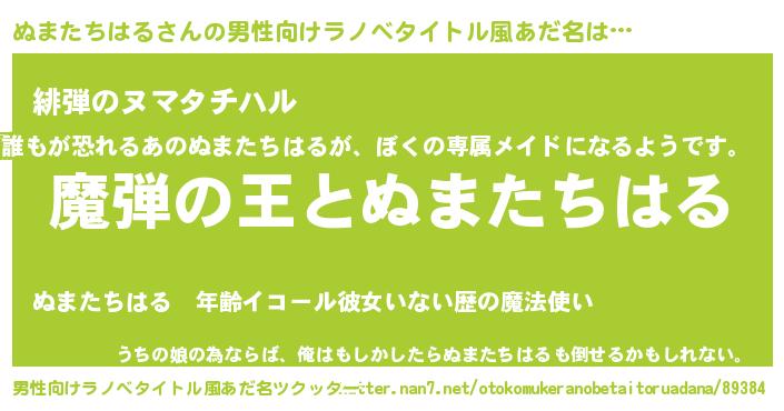 | 女子向けラノベタイトル風あだ名 | 『乙女ゲームの破滅フラグしかない悪役ぬまたちはるに転生してしまった…』 |