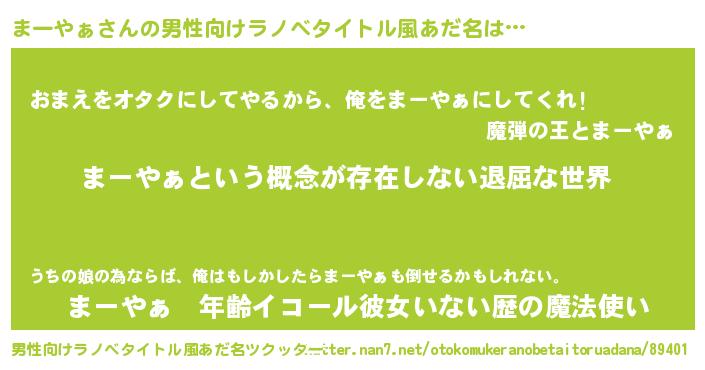 | 胡散臭い通販商品みたいなあだ名 | 『来世でも幸せになれる健康食品…その名も「まーやぁ」』 |