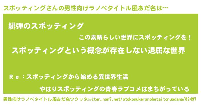 | 胡散臭い通販商品みたいなあだ名 | 『来世でも幸せになれる健康食品…その名も「スポッティング」』 |