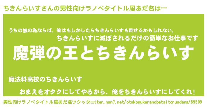 | 女子向けラノベタイトル風あだ名 | 『ちきんらいすが死なない童話 林檎のちきんらいすの診療簿』 |