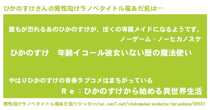 | 女子向けラノベタイトル風あだ名 | 『ひかのすけの玉の輿計画!』 |