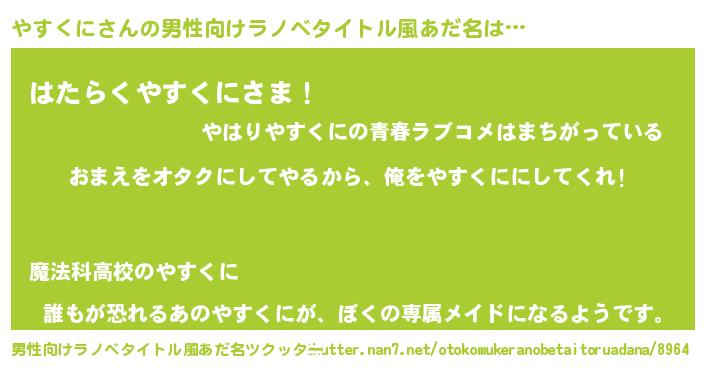 | 女子向けラノベタイトル風あだ名 | 『やすくに恋絵巻』『やすくに伯爵の花嫁』 |