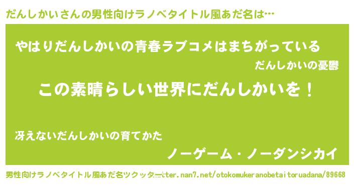 | 胡散臭い通販商品みたいなあだ名 | 『あなたにだけ特別に提供する限定10本のレアな日本酒…その名も「だんしかい」』 |