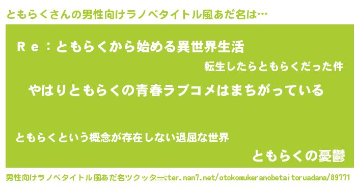 | ファンタジー風あだ名 | 『エターナルトモラクー』『ゼトモトゥ』 |