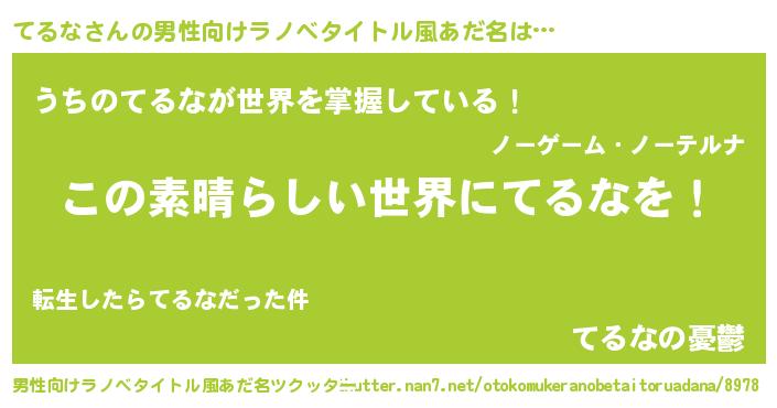 | 女子向けラノベタイトル風あだ名 | 『乙女ゲームの破滅フラグしかない悪役てるなに転生してしまった…』 |